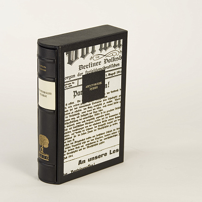 Книга облечена в составной переплет: кожа Bibliofile Ziegen Leder. Вставки на переплете и футляре – гравюры ручной работы, выполненные в технике офорт. Тиснение золотом 24К, обрез золоченый, футляр обтянут кожей с тиснением золотом.