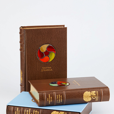 Книга облечена в переплёт ручной работы из кожи производства компании Russells (Великобритания), украшенный витражами в виде медальонов, изготовленный мастером Марио Готтарделло (Италия). Тиснение золотом 24 карата. Футляр обтянут шелком с тиснением фольгой в три цвета.