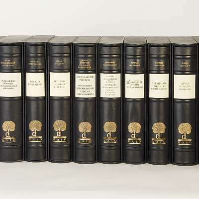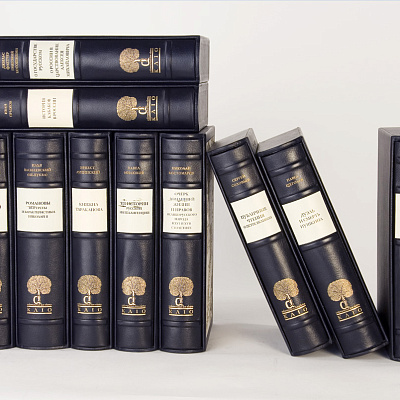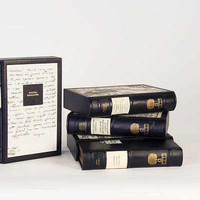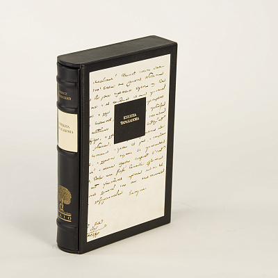 Книга облечена в составной переплет: кожа Bibliofile Ziegen Leder. Вставки на переплете и футляре – гравюры ручной работы, выполненные в технике офорт. Тиснение золотом 24К, обрез золоченый, футляр обтянут кожей с тиснением золотом.