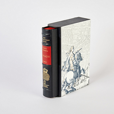 Каждый том помещен в футляр, который запечатан сюжетной иллюстрацией (гравюра) с тиснением золотом.