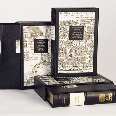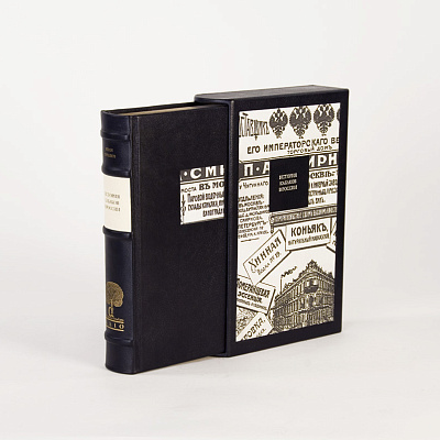 Книга облечена в составной переплет: кожа Bibliofile Ziegen Leder. Вставки на переплете и футляре – гравюры ручной работы, выполненные в технике офорт. Тиснение золотом 24К, обрез золоченый, футляр обтянут кожей с тиснением золотом.