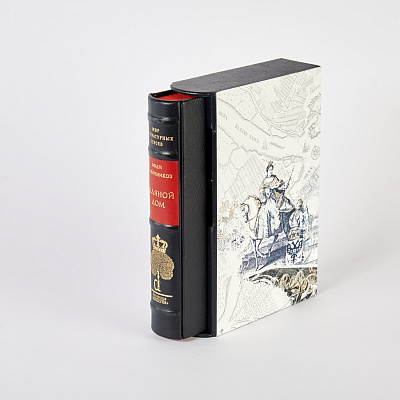 Каждый том помещен в футляр, который запечатан сюжетной иллюстрацией (гравюра) с тиснением золотом.