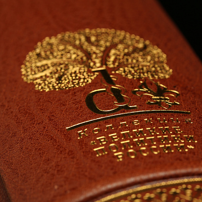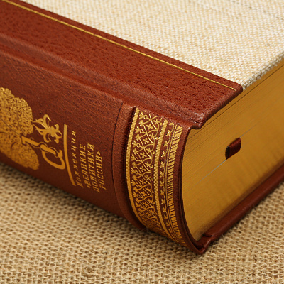 Книга облечена в составной переплет: из кожи Russels (Великобритания) и натурального необработанного шелка Setefi cio VIAGGI (Италия), изготовленный мастером Марио Готтарделло (Италия). Тиснение золотом 24K.