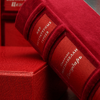 Книга облечена в переплет из бархата Tessile Ricciardi (Venezia) с накладкой из алюминия. На корешке вставки из кожи с тиснением серебряной фольгой. Обрез серебрённый. Футляр обтянут кожей с тиснением.