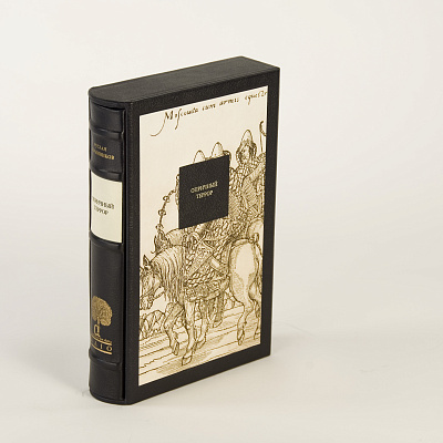 Книга облечена в составной переплет: кожа Bibliofile Ziegen Leder. Вставки на переплете и футляре – гравюры ручной работы, выполненные в технике офорт. Тиснение золотом 24К, обрез золоченый, футляр обтянут кожей с тиснением золотом.