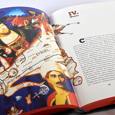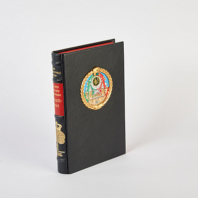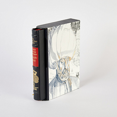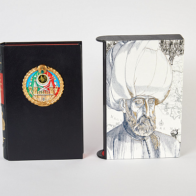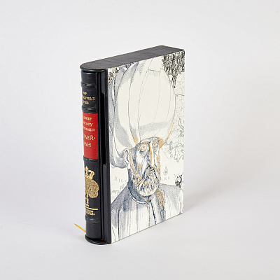 Книга в кожаном переплете ручной работы. На первой сторонке — медальон, выполненный художниками вручную и заключенный в рамку из латуни с эмалью. Живописное изображение на медальоне соответствует содержанию каждого тома. По переплету тиснение золотом 24 карата.