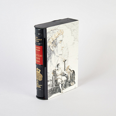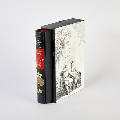 Каждый том помещен в футляр, который запечатан сюжетной иллюстрацией (гравюра) с тиснением золотом.