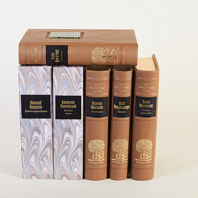 Книга облечена в переплет ручной работы из кожи производства компании J. Hewit & Sons (Великобритания) со вставками из натуральных камней. Каждому тому соответствует свой камень.