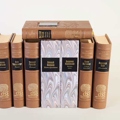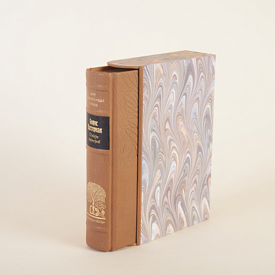 Книга облечена в переплет ручной работы из кожи производства компании J. Hewit & Sons (Великобритания) со вставками из натуральных камней. Каждому тому соответствует свой камень.