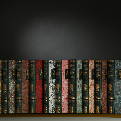 Книга облечена в составной переплет из кожи Russels (Великобритания). Тиснение золотом 24K. Обрез золоченый, футляр обтянут мраморной бумагой RELMA (Франция) с тиснением золотом.