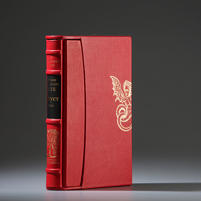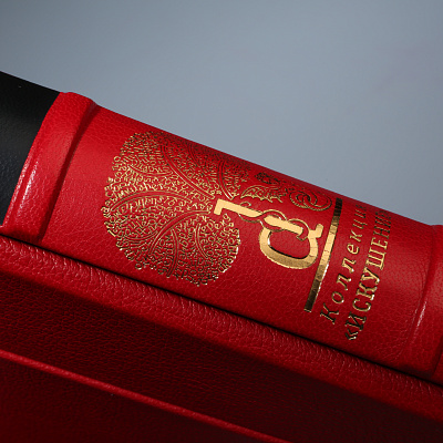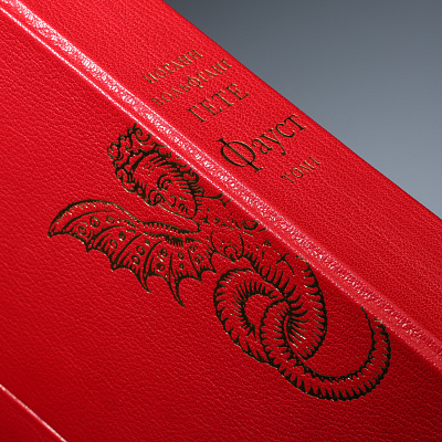 Книга облечена в составной переплет: кожа Bibliofile Ziegen Leder и переплетный шелк Comtesse. Вставка-цветок на обложке – гравюра ручной работы, выполненная в технике офорта Тиснение золотом 24К, обрез золоченый, футляр обтянут кожей с тиснением золотом.
