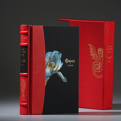 Книга облечена в составной переплет: кожа Bibliofile Ziegen Leder и переплетный шелк Comtesse. Вставка-цветок на обложке – гравюра ручной работы, выполненная в технике офорта Тиснение золотом 24К, обрез золоченый, футляр обтянут кожей с тиснением золотом.