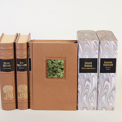 Книга облечена в переплет ручной работы из кожи производства компании J. Hewit & Sons (Великобритания) со вставками из натуральных камней. Каждому тому соответствует свой камень.