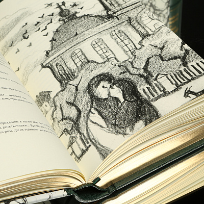 Книга облечена в составной переплет из кожи Russels (Великобритания). Тиснение золотом 24K. Обрез золоченый, футляр обтянут мраморной бумагой RELMA (Франция) с тиснением золотом.