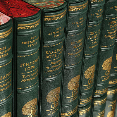 Книга облечена в составной переплет из кожи Russels (Великобритания). Тиснение золотом 24K. Обрез золоченый, футляр обтянут мраморной бумагой RELMA (Франция) с тиснением золотом.