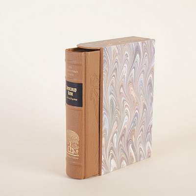 Книга облечена в переплет ручной работы из кожи производства компании J. Hewit & Sons (Великобритания) со вставками из натуральных камней. Каждому тому соответствует свой камень.
