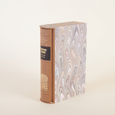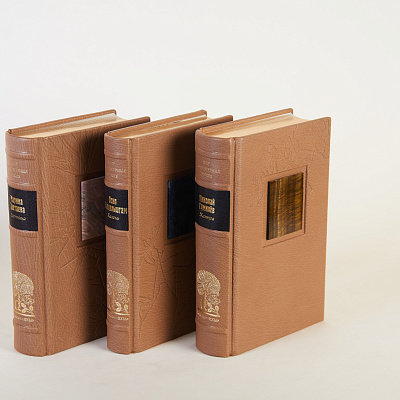 Книга облечена в переплет ручной работы из кожи производства компании J. Hewit & Sons (Великобритания) со вставками из натуральных камней. Каждому тому соответствует свой камень.