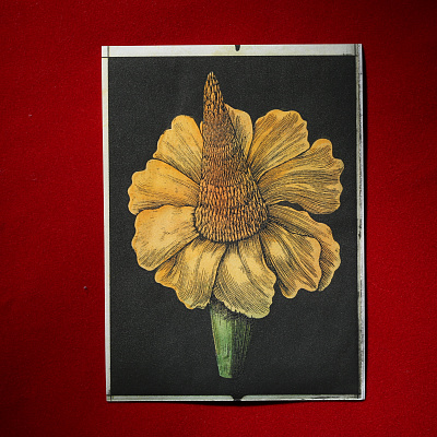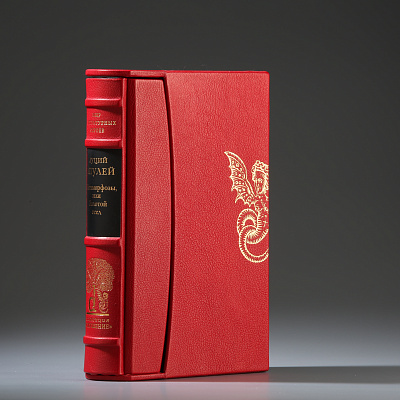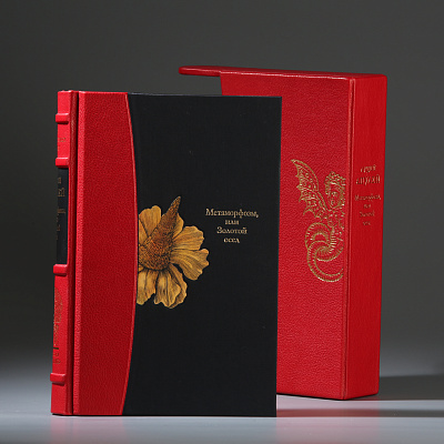 Книга облечена в составной переплет: кожа Bibliofile Ziegen Leder и переплетный шелк Comtesse. Вставка-цветок на обложке – гравюра ручной работы, выполненная в технике офорта Тиснение золотом 24К, обрез золоченый, футляр обтянут кожей с тиснением золотом.