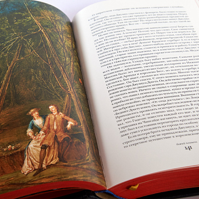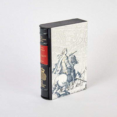 Каждый том помещен в футляр, который запечатан сюжетной иллюстрацией (гравюра) с тиснением золотом.