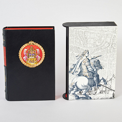 Книга в кожаном переплете ручной работы. На первой сторонке — медальон, выполненный художниками вручную и заключенный в рамку из латуни с эмалью. Живописное изображение на медальоне соответствует содержанию каждого тома. По переплету тиснение золотом 24 карата.