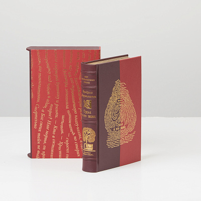 Книга облечена в переплет из кожи Sirpel Vicenza итальянского производства. Тиснение золотом 24К, обрез золоченый, футляр обтянут бумагой с тиснением золотом.