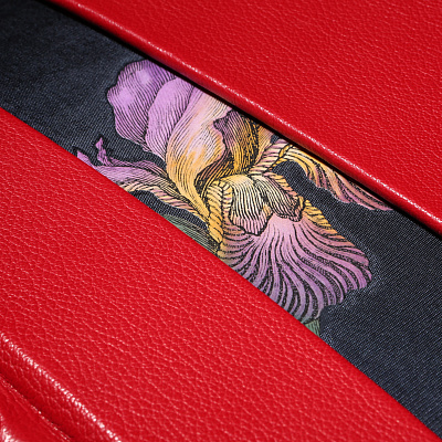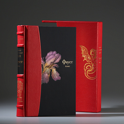 Книга облечена в составной переплет: кожа Bibliofile Ziegen Leder и переплетный шелк Comtesse. Вставка-цветок на обложке – гравюра ручной работы, выполненная в технике офорта Тиснение золотом 24К, обрез золоченый, футляр обтянут кожей с тиснением золотом.