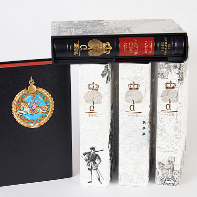 Каждый том помещен в футляр, который запечатан сюжетной иллюстрацией (гравюра) с тиснением золотом.