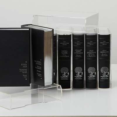 Книга облечена в переплет из кожи Sirpel. Vicenza (Italia). Тиснение серебряной фольгой, серебрённый обрез. Футляр из оргстекла производства Plexiglass Gs (Germany).