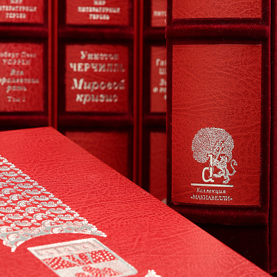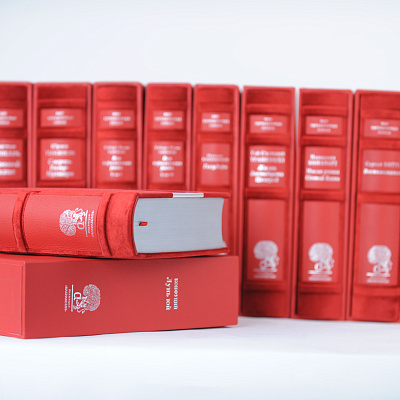 Книга облечена в переплет из бархата Tessile Ricciardi (Venezia) с накладкой из алюминия. На корешке вставки из кожи с тиснением серебряной фольгой. Обрез серебрённый. Футляр обтянут кожей с тиснением.
