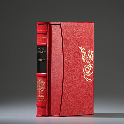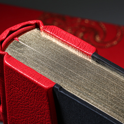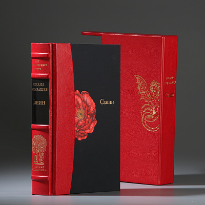 Книга облечена в составной переплет: кожа Bibliofile Ziegen Leder и переплетный шелк Comtesse. Вставка-цветок на обложке – гравюра ручной работы, выполненная в технике офорта Тиснение золотом 24К, обрез золоченый, футляр обтянут кожей с тиснением золотом.
