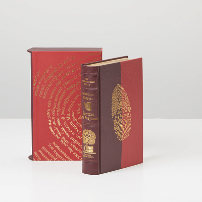Книга облечена в переплет из кожи Sirpel Vicenza итальянского производства. Тиснение золотом 24К, обрез золоченый, футляр обтянут бумагой с тиснением золотом.