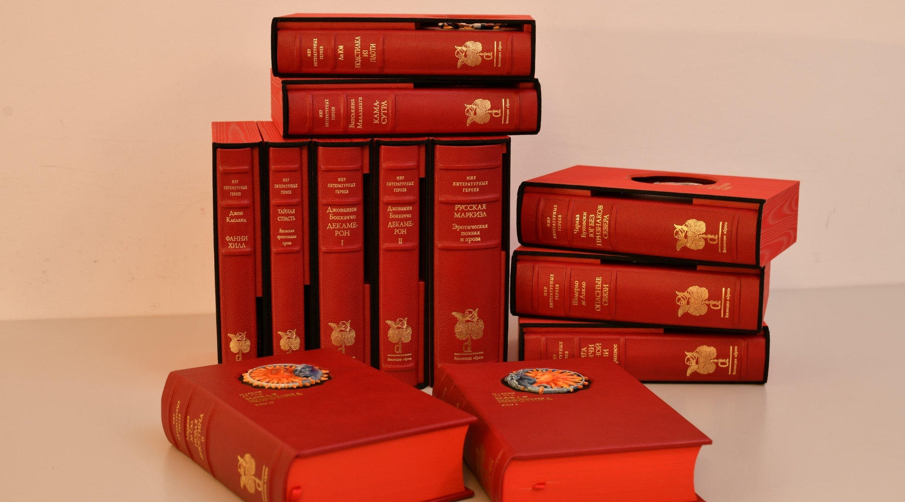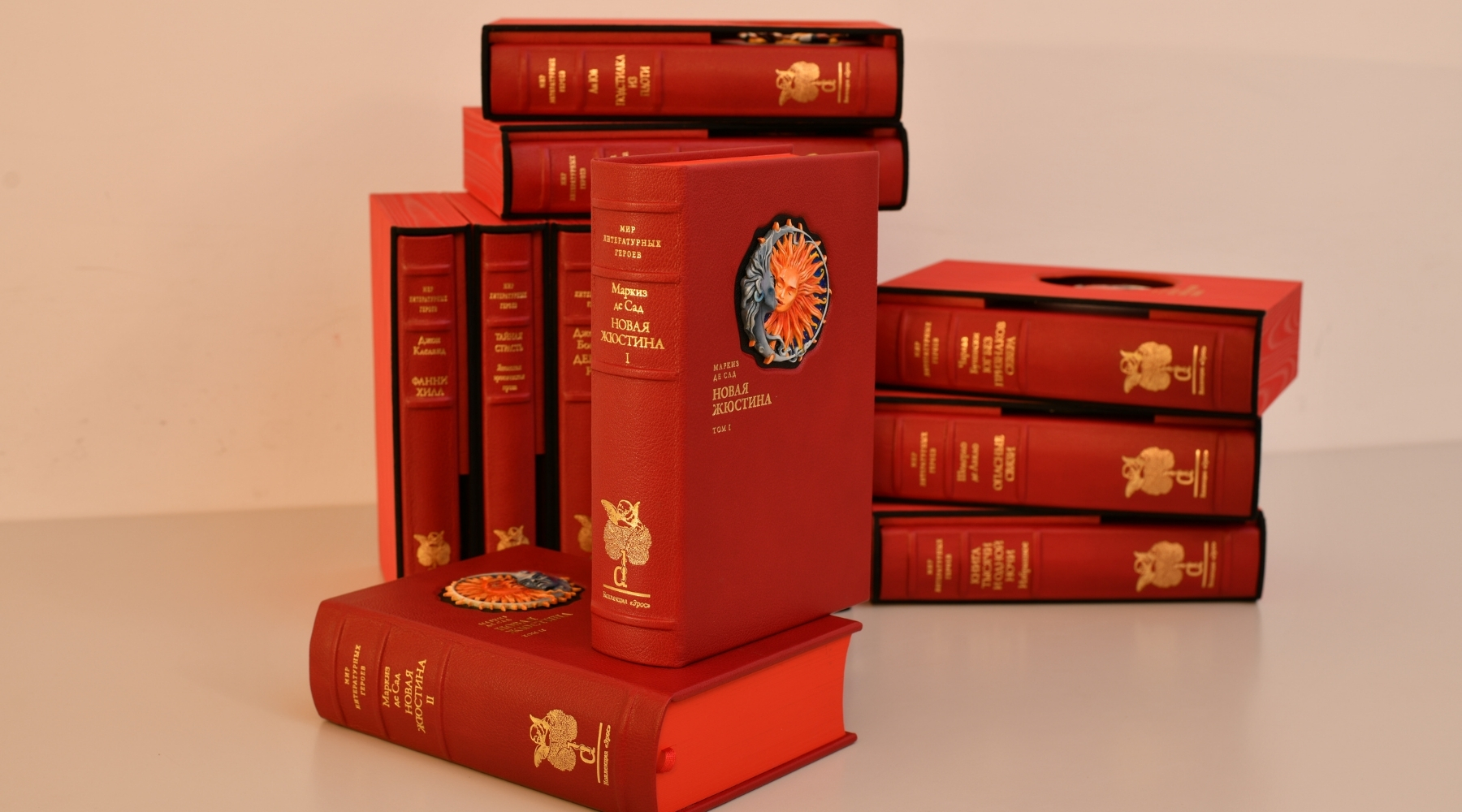 Каждый том коллекции «Эрос» декорирован изготовленным вручную медальоном, соответствующим содержанию книги. Медальоны украшены эмалью.