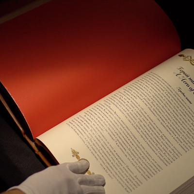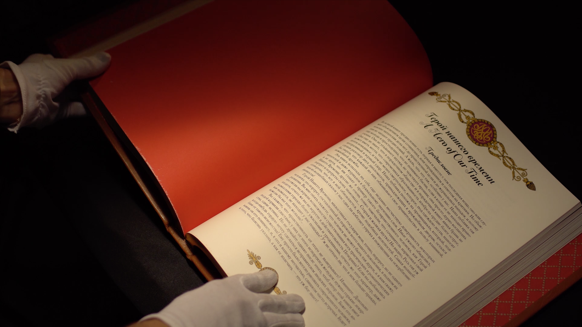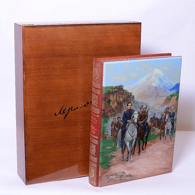 Подарочное издание избранных произведений М.Ю. Лермонтова на русском и английском языках в цельнокожаном переплете ручной работы, украшенном лаковым панно Федоскино.